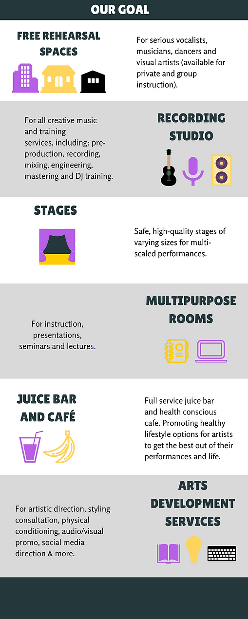 Our vision is to build a fully functioning, spacious, high quality facility with the best structure, layout, and resources available to accommodate youth artists. In addition, a place where community events will take place and high school kids can be mentored and inspired.